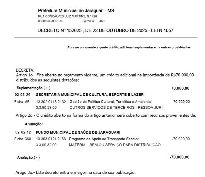 Conforme decreto publicado, o valor foi suplementado no orçamento da cultura com recursos provenientes de anulação de dotação vinculada ao Fundo Municipal de Saúde.