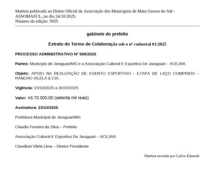 O evento recebeu R$ 70.000,00 por meio de Termo de Colaboração firmado entre a Prefeitura e a Associação Cultural e Esportiva de Jaraguari (ACEJAR), destinado à realização da etapa de laço comprido no Rancho Vilela.